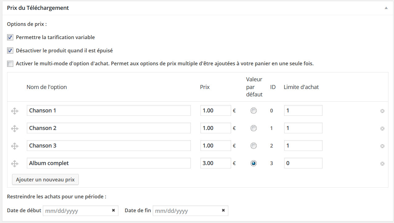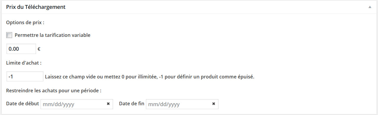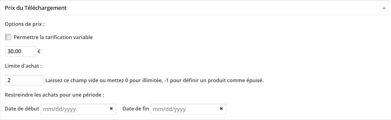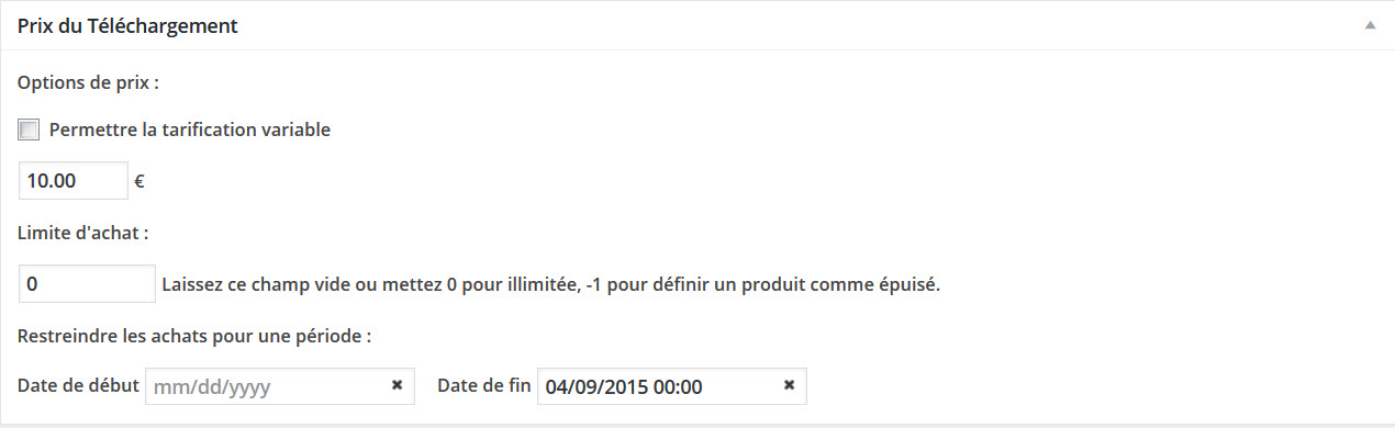 Purchase Limit vous permet également de limiter les dates de disponibilité des téléchargements à acheter en fixant une date de début ou de fin.