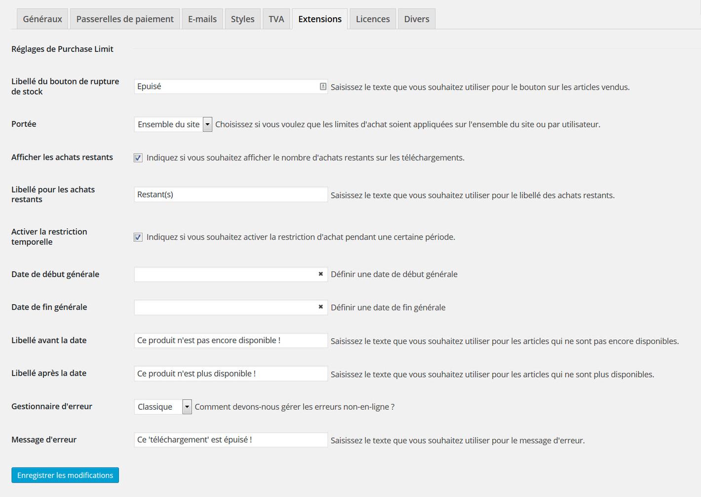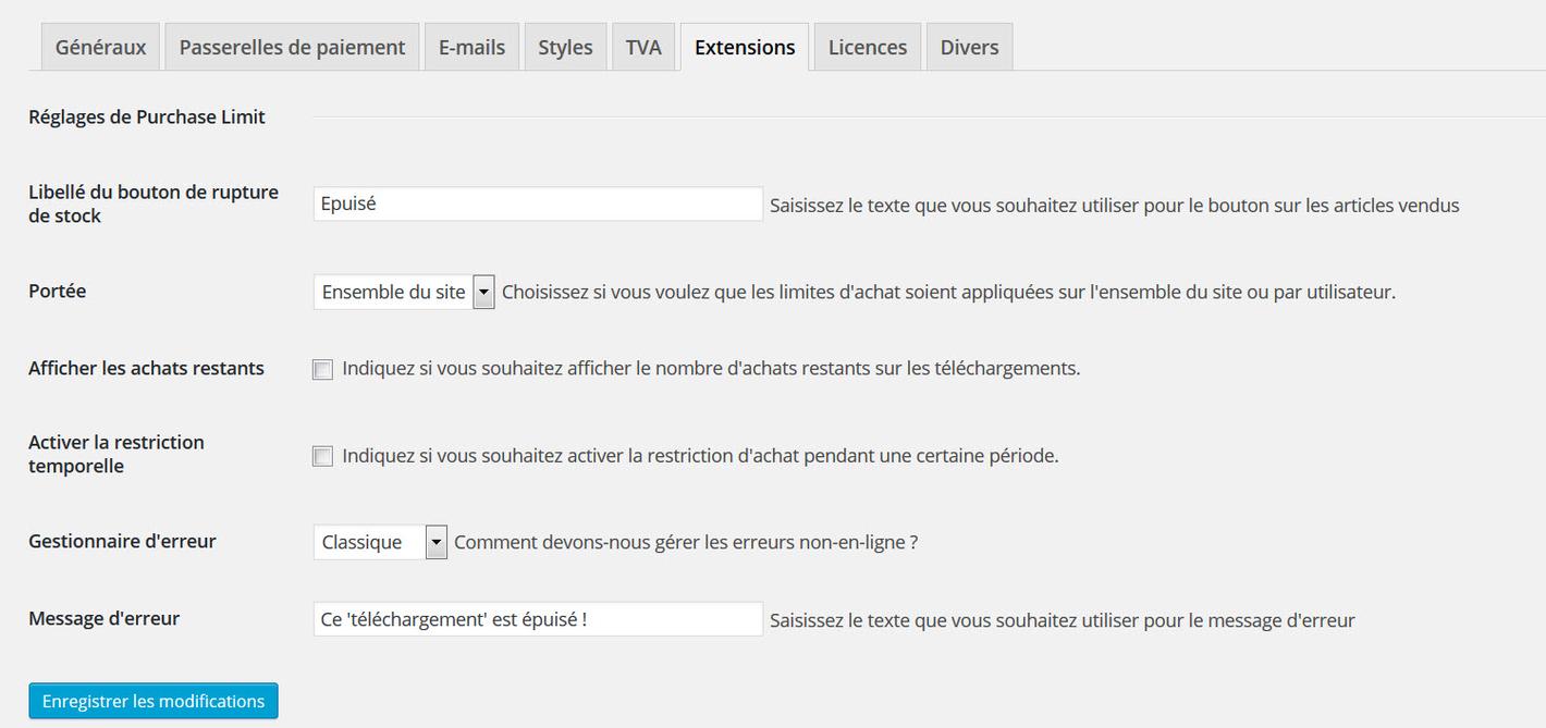EDD Purchase Limit Translations est l’extension de traduction française de Purchase Limit pour Easy Digital Downloads.[ref]L’extension proposée ici ne comprend que les fichiers de traductions. Vous devez avoir, au préalable, installé l’extension à traduire.[/ref]