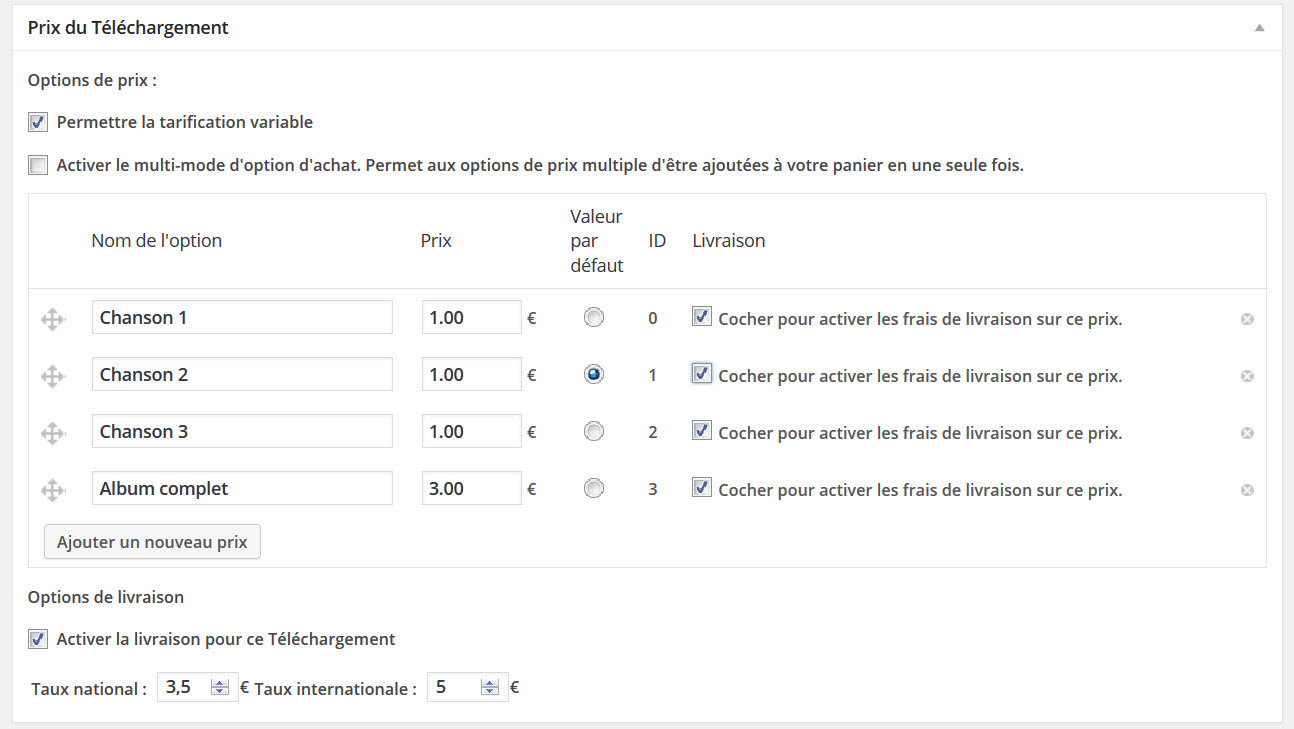 La livraison peut être activée individuellement sur chaque produit et peut même être activée sur des prix spécifiques pour les produits avec des options multiples de prix.